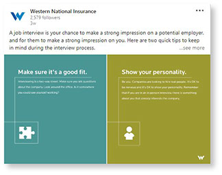 If you’re looking for relevant and engaging content to share with your clients, why not check out Western National’s social media platforms? We have company pages on Facebook, Twitter, and LinkedIn where we share a variety of content. Follow us to get access to content that you can repost on your own social media pages or share with your clients, including safety tips and awareness topics, local and national insurance industry information, infographics, holiday illustrations, blog articles, company news, and more!